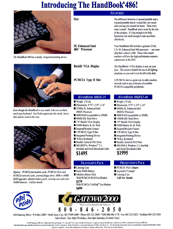 The Gateway “Handbook 486” was introduced in mid 1993. Not to be mistaken for the original Gateway Handbook launched in 1992 which sported a Chips and Technologies (C&T) 286 clone, the updated Handbook 486 used a genuine Intel CPU and had the addition of a Integrated Pointing Device (IPD) which Gateway patented. Its dimensions were 9.75” x 5.9” x 1.6” and weighed in at 2.9lbs (1.3Kg). The original machine had been sourced in the far east by Ted Waitt and Gateway purchased exclusivity on it and began updating the original specification, which became the 486 model launched in 1993.