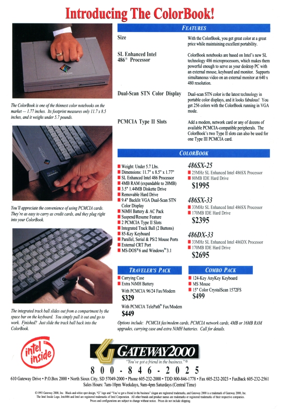 Gateway announced the ColorBook in September 1993. This was a time when portable computers were leaving the monochrome age and entering the colour era. Gateway was able to lower the costs of its colour portable by using a technology called “dual scan”, which was basically 2 LCD screens tied together, thus reducing the expense of the larger single LCD of the same size. Colour was pretty new at this time, and colour LCD panels still had some technical limitations such as depth of colour, ghosting and luminosity in real world conditions. We are so spoilt today with life like screens that it is hard to believe how impressive these first colour portables were.